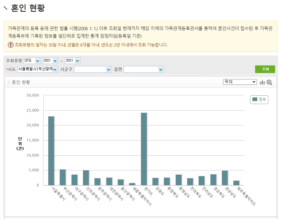 혼인 현황 데이터는 일별 혼인 신고된 건수를 데이터로 보여주고 있습니다. 전체 현황을 보기 위해 2021년 1월 ~ 6월까지의 데이터를 전체 시도 기준으로 조회하였고, 이중 경기도의 혼인 건수가 가장 높게 보이고 있습니다. 기준일까지의 혼인 건수는 93,613건입니다.