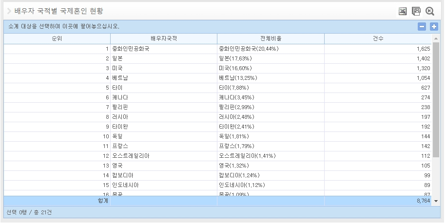 국제 혼인이 증가되고 있는 시점에서 배우자의 국적 데이터도 제공하고 있습니다. 중국, 일본, 미국, 베트남, 타이 순으로 국제 혼인 건수가 높으며 전체에서 약 75.8%를 차지하고 있습니다.