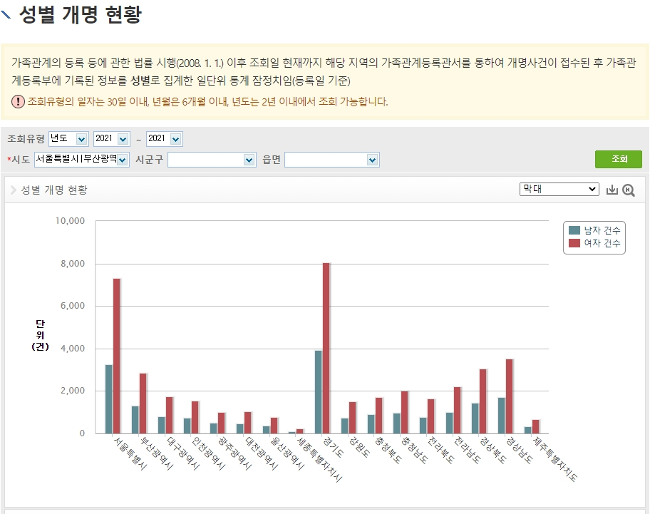 이번 포스팅은 성별 개명 현황 및 개명 신고 이름을 살펴보도록 하겠습니다. 기준연도는 2021년 1월 ~ 6월까지이며 시군구별 남녀 개명 건수를 개별적으로 확인할 수 있습니다. 기준일까지 약 6만여 건이 처리된 것으로 보입니다.