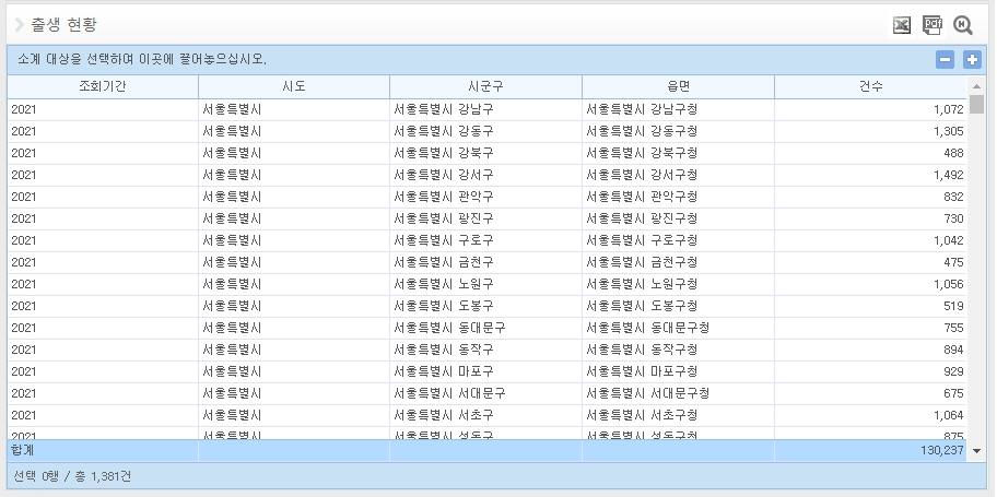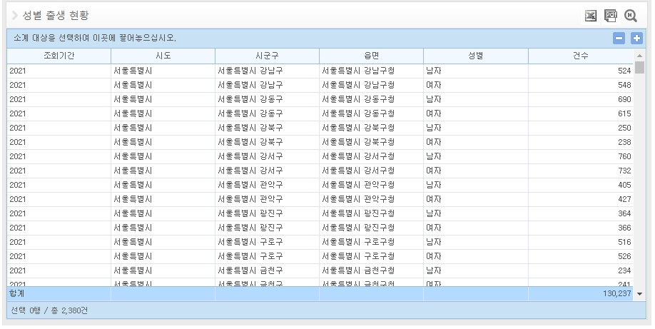 출생 현황 조회 조건과 동일하게 성별 출생 현황을 조회한 결과입니다. 지역별로 구분된 데이터를 확인할 수 있으며, 남자 건수 66,948명, 여자 건수 63,289명으로 약 5.78% 정도 남자 아기가 많이 출생하였음을 볼 수 있습니다.