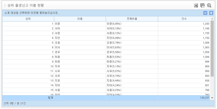 조회한 데이터는 엑셀 또는 PDF로 다운로드 가능하며, 아래는 2021년 1월 ~ 6월 기준 상위 출생신고 이름 현황입니다. 이준, 서아, 서준, 지안, 도윤 등의 이름이 인기 아기 이름으로 보입니다.