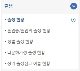 왼쪽 메뉴에서 출생 탭을 클릭하면 아래와 같이 출생 현황, 혼인 중/혼인 외 출생 현황, 성별 출생 현황, 다문화가정 출생 현황, 상위 출생신고 이름 현황 정보를 차트 및 데이터를 조회할 수 있습니다.