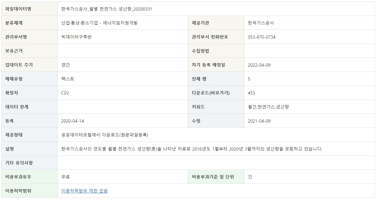 이번 포스팅은 공공데이터포털 내 한국가스공사에서 제공하는 연도별 월별 천연가스 생산량(톤)을 나타낸 자료입니다. 2016년도 1월부터 2020년 3월까지의 생산량을 포함하고 있습니다.