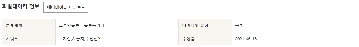 이번 포스팅은 전국 주차장 정보 표준 데이터 정보입니다. 주차장 정보는 이미 많은 어플에서 위치 및 사진, 후기, 가격정보를 제공하고 있습니다. 표준 데이터에서 분류체계는 교통 및 물류이며 주차장명, 주차장 구분(공영, 민영), 주차장 주소, 주차구획수, 급지 구분, 운영 요일, 운영시간, 요금정보 등을 제공하고 있습니다.
