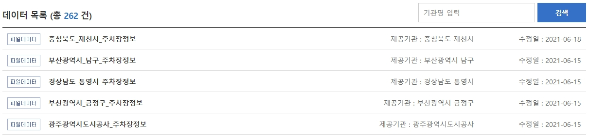 아래 데이터 목록을 보면 총 262곳의 시군구에서 데이터를 취합하고 있고 표준 데이터의 갱신주기는 개별 파일마다 다름을 확인할 수 있습니다.