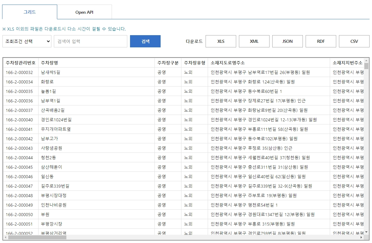 아래 조회 조건(주차장명, 주차장 구분, 주차장 주소 등)을 이용해 원하는 데이터를 필터 하여 조회할 수 있습니다.
