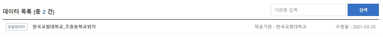 아래 데이터 목록을 보면 한국교원대학교에서 초중등학교위치 데이터를 취합하고 있습니다.