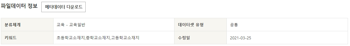 이번 포스팅은 전국 초중등학교 위치 표준 데이터 정보입니다. 초중등학교 위치 정보(학교명, 학교 위치 등)를 제공하며, 데이터 분류체계는 교육 - 교육일반입니다. 초등학교 소재지, 중학교 소재지, 고등학교 소재지 정보를 조회할 수 있습니다.