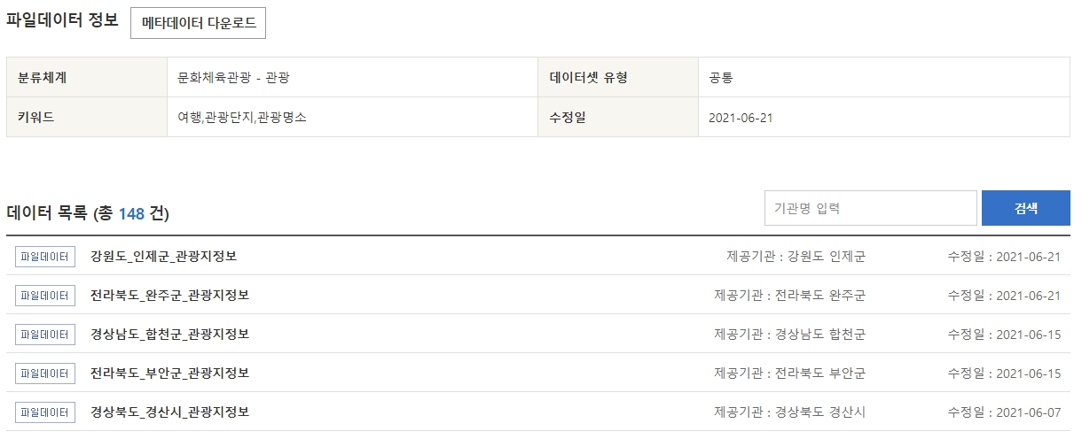 관광지 정보(편익시설, 관광지 소개 등)를 제공하며 여행, 관광단지, 관광명소 등의 정보를 확인할 수 있습니다. 148개의 시군구에서 제공한 관광지 정보를 취합하고 있습니다. 표준 데이터의 갱신주기는 개별 파일마다 다릅니다.