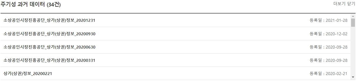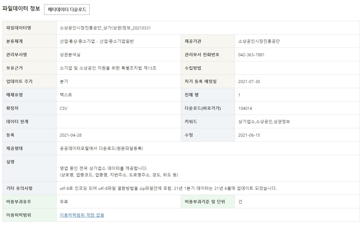 영업 중인 전국 상가업소 데이터를 제공합니다. (상호명, 업종코드, 업종명, 지번주소, 도로명주소, 경도, 위도 등) 주기성으로 갱신되는 데이터로서 2020/12/31 기준으로 작성되었습니다.