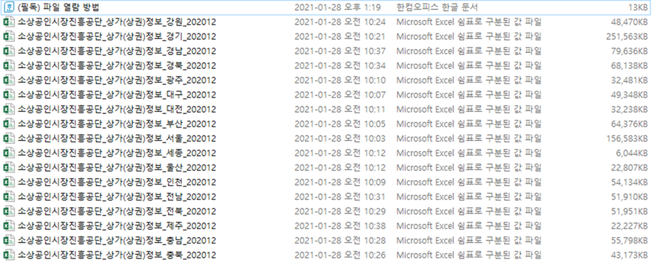 Zip으로 압축된 파일을 다운로드한 후 압축을 풀면 아래와 같이 지역별로 파일을 확인할 수 있습니다. 단, UTF-8 형식으로 추출된 데이터이므로 엑셀 형식으로 파일을 열기 위해서는 "필독 파일 열람 방법"을 참조하시기 바랍니다.