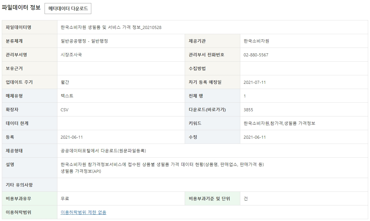 한국소비자원 참가 격정보 서비스에 접수된 상품별 생필품 가격 데이터 현황(상품명, 판매업소, 판매 가격 등) 및 생필품 가격정보를 제공하고 있습니다.