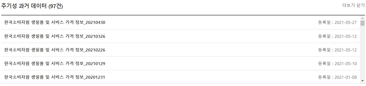주기성 과거 데이터를 보면 매월 신규 데이터로 업데이트되고 있음을 알 수 있습니다. 이번 포스팅에서는 2021년 05월 기준의 데이터를 살펴보도록 하겠습니다.