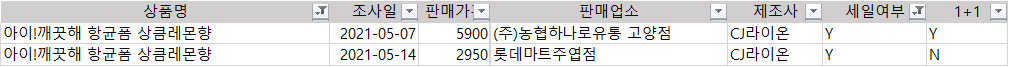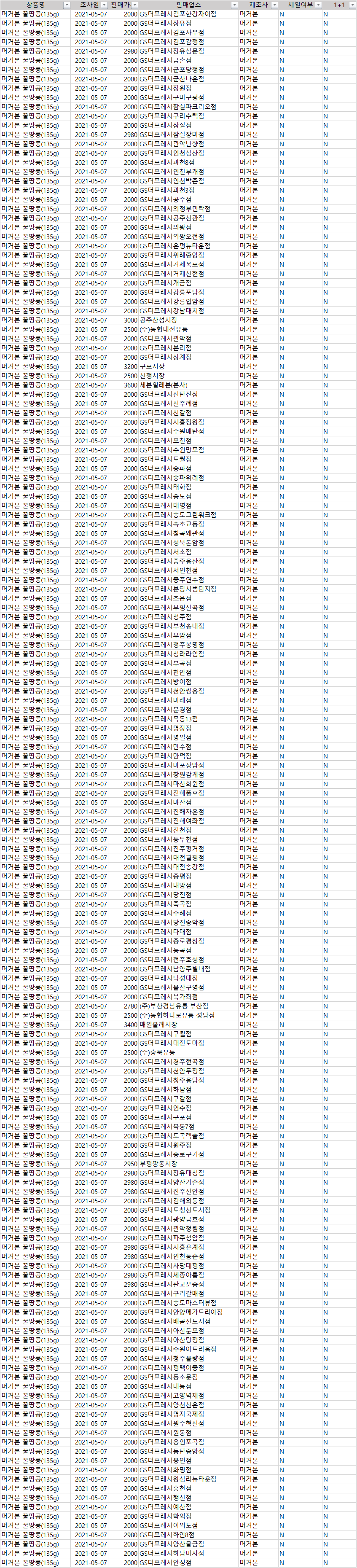 머거본 꿀땅콩의 경우 현재 168곳의 판매업소에서 판매되고 있으며 판매가(2000원~3600원)가 상이한 것을 볼 수 있습니다. 또한 세일 여부 및 1+1 행사 여부도 데이터로 확인할 수 있습니다.