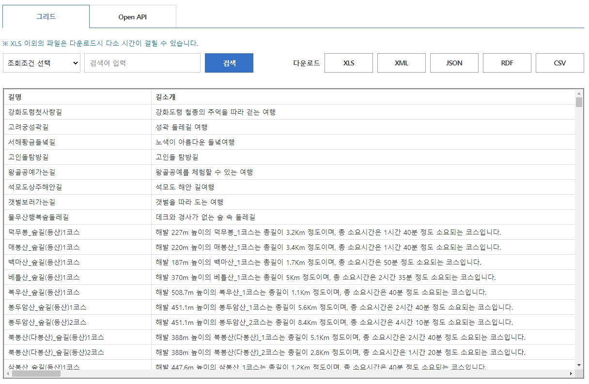 이번 포스팅은 전국 걷기좋은길 관광정보 표준 데이터 정보입니다. 걷기좋은길 관광정보(경로정보, 총 소요시간 등)를 제공 및 주요 키워드인 길 탐방, 관광코스, 관광 경로 정보를 제공하고 있습니다.