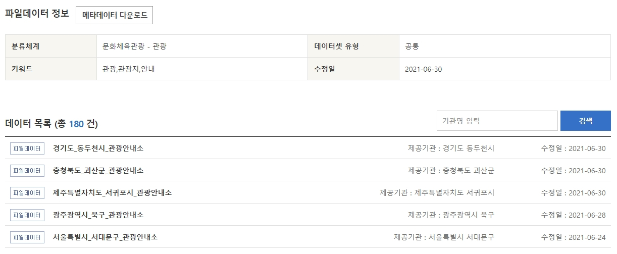 아래 데이터 목록을 보면 총 180곳의 시군구에서 데이터를 취합하고 있고 표준 데이터의 갱신주기는 개별 파일마다 다름을 확인할 수 있습니다.