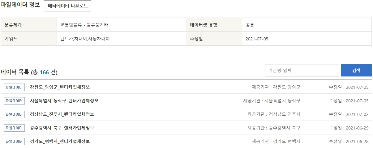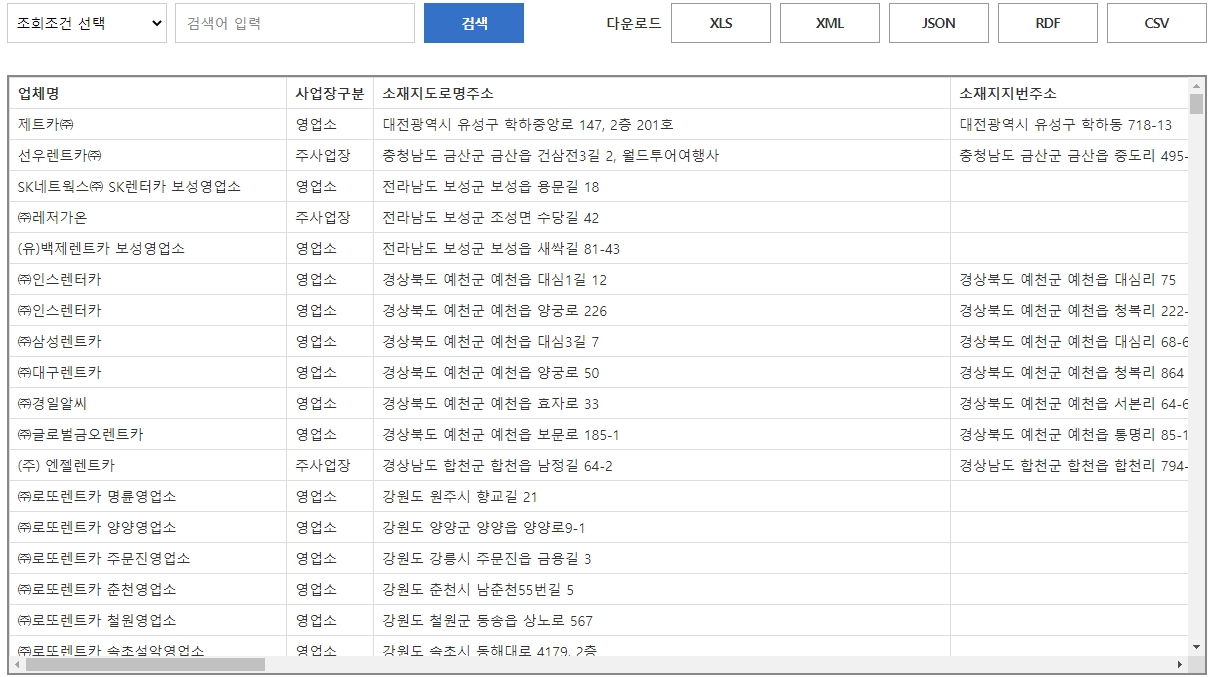 이번 포스팅은 전국 렌터카 업체 표준 데이터 정보입니다. 렌터카업체정보(위치, 자동차보유대수 등)를 제공 및 주요 키워드인 렌트카, 차대여, 자동차대여 정보를 제공하고 있습니다.
