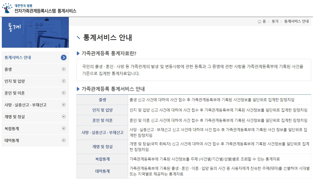전자 가족관계 등록시스템에서는 가족관계 등록부에 기록된 정보를 기준으로 다양한 통계서비스를 제공하고 있습니다.