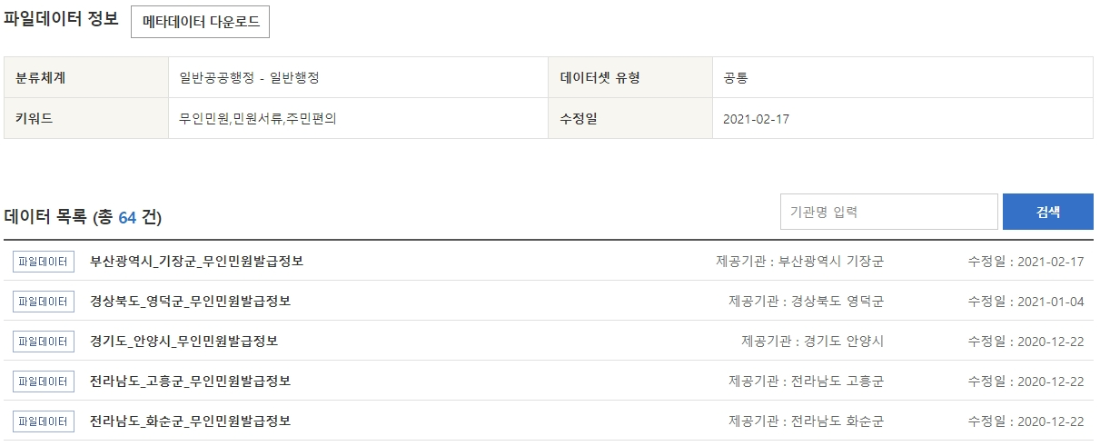 이번 포스팅은 전국 무인민원 발급정보 표준 데이터 정보입니다.