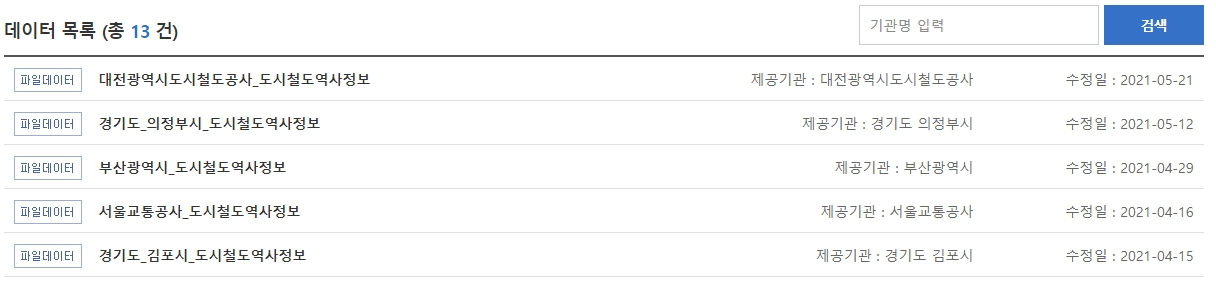 주요 정보는 역 번호 / 역사명 / 영문 역사명 / 한자 역사명 / 역위도 / 역경도 / 역사 도로명주소 등으로 구성되어있습니다. 데이터는 철도노선정보와 마찬가지로 시 또는 교통 / 철도공사에서 지역별로 제공하고 있습니다.